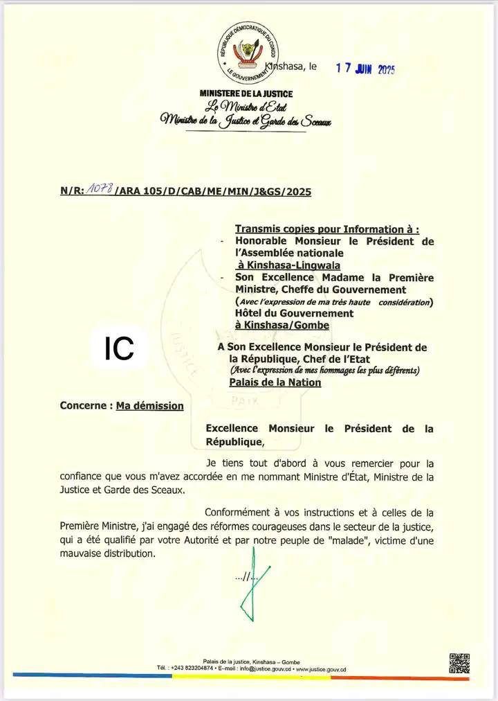 ✅OFFICIELLE : Voici la lettre de démission du ministre Constant Mutamba. C’est officiel, il n’est plus ministre de la justice de la RDC. Il accuse de #Rwanda et l’AfC/M23 d’avoir comploté contre lui.